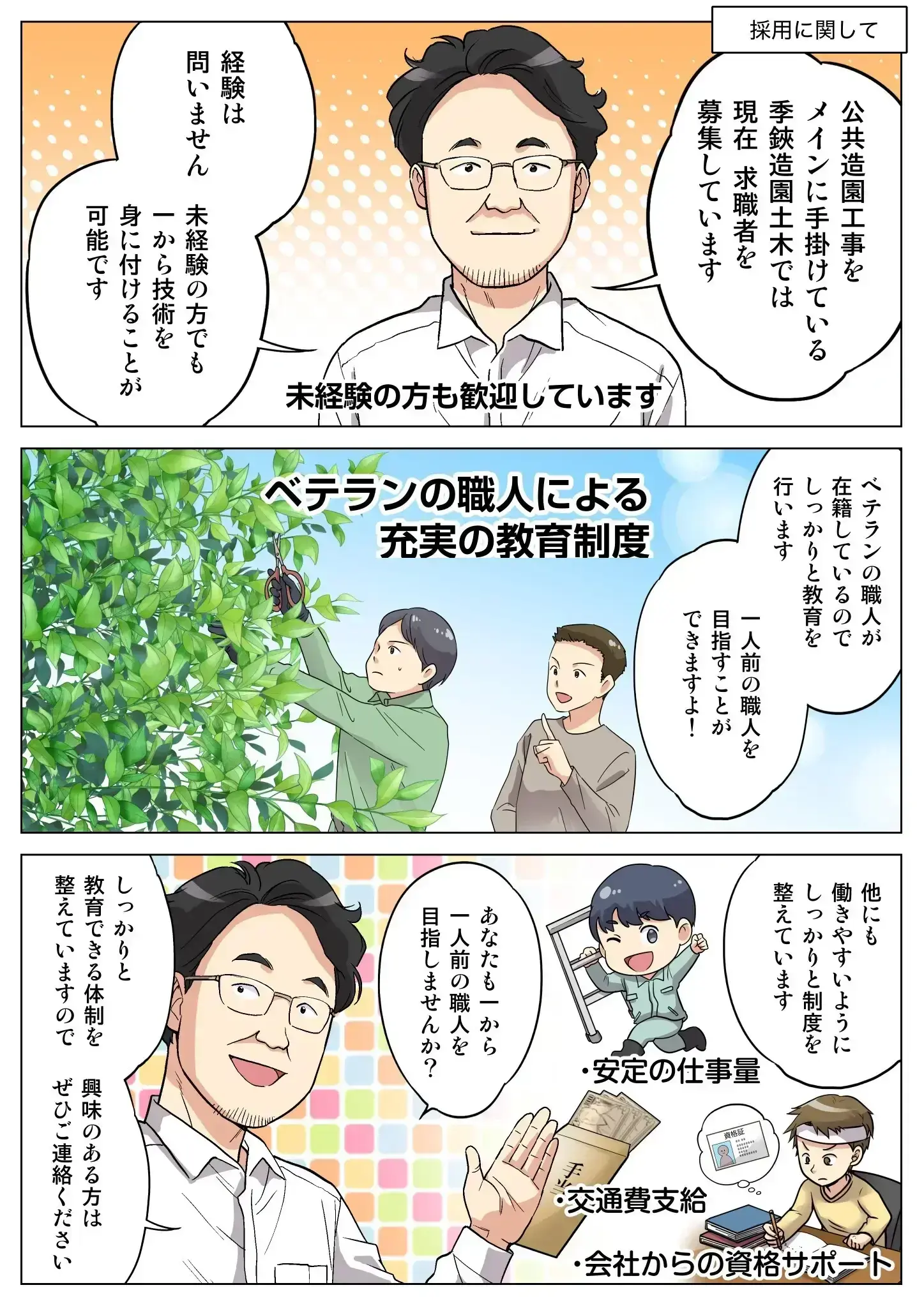 季鋏造園土木では、共に働く従業員を募集しております。経験者はもちろん、未経験の方でも大歓迎です。経験豊富な従業員がしっかりと指導いたしますので、未経験の方でも安心してご応募ください。弊社には、未経験からでも一人前の職人を目指せる環境が用意されています。